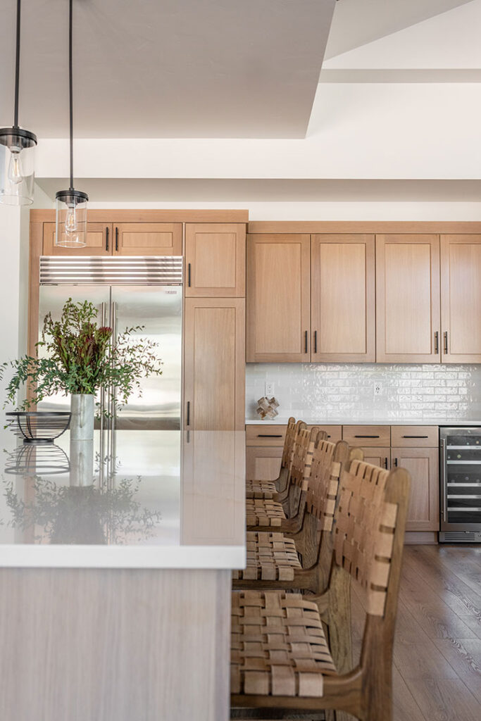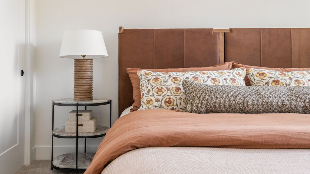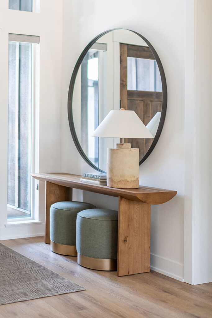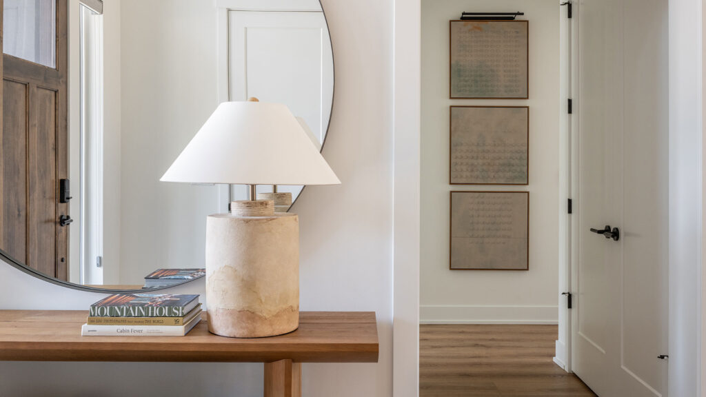 Our texture story continues with woven leather counter stools, a sculpted entryway console and stone lamp, wabi-sabi artwork, and luxurious layers of bedding in unique palettes in each bedroom.