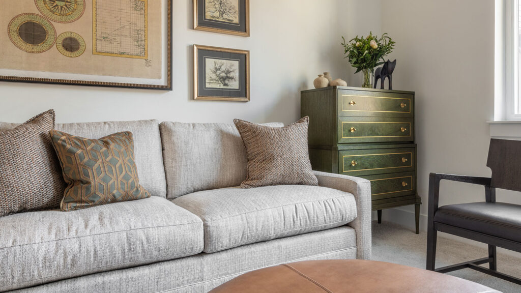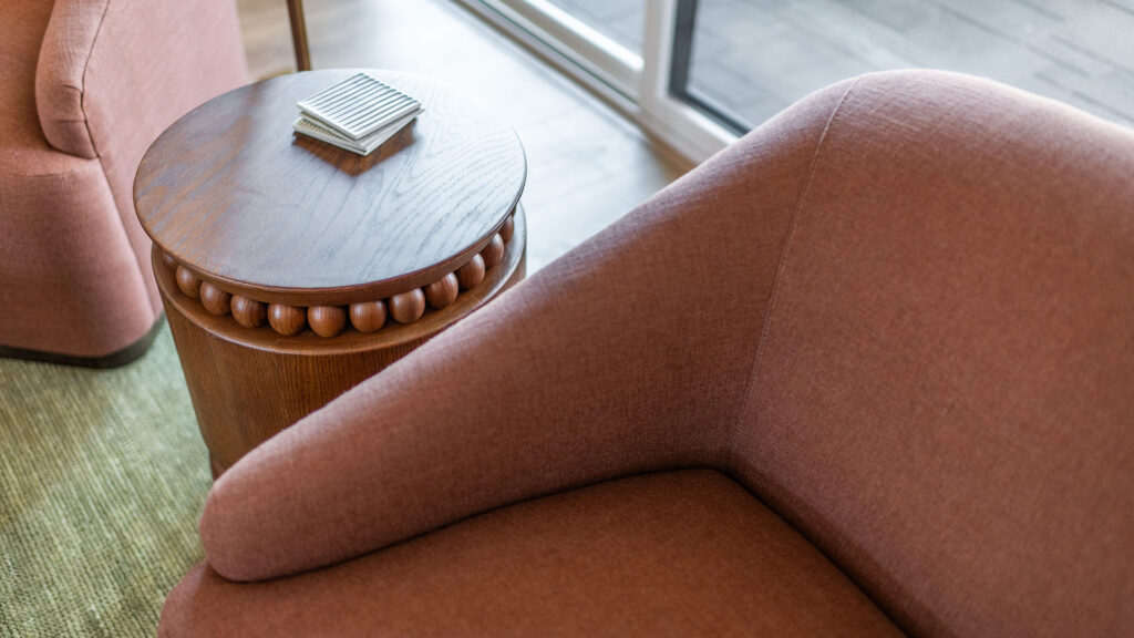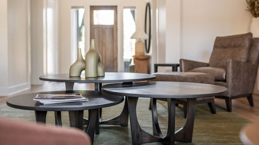 In the great room, we laid a delightful foundation with a grassy green area rug and added rich leather and upholstery to the seating arrangement. The custom designed nesting coffee tables, a collaboration with Portland’s Garage Goods, allow for flexibility in playing a game, serving up snacks or kicking your feet up.