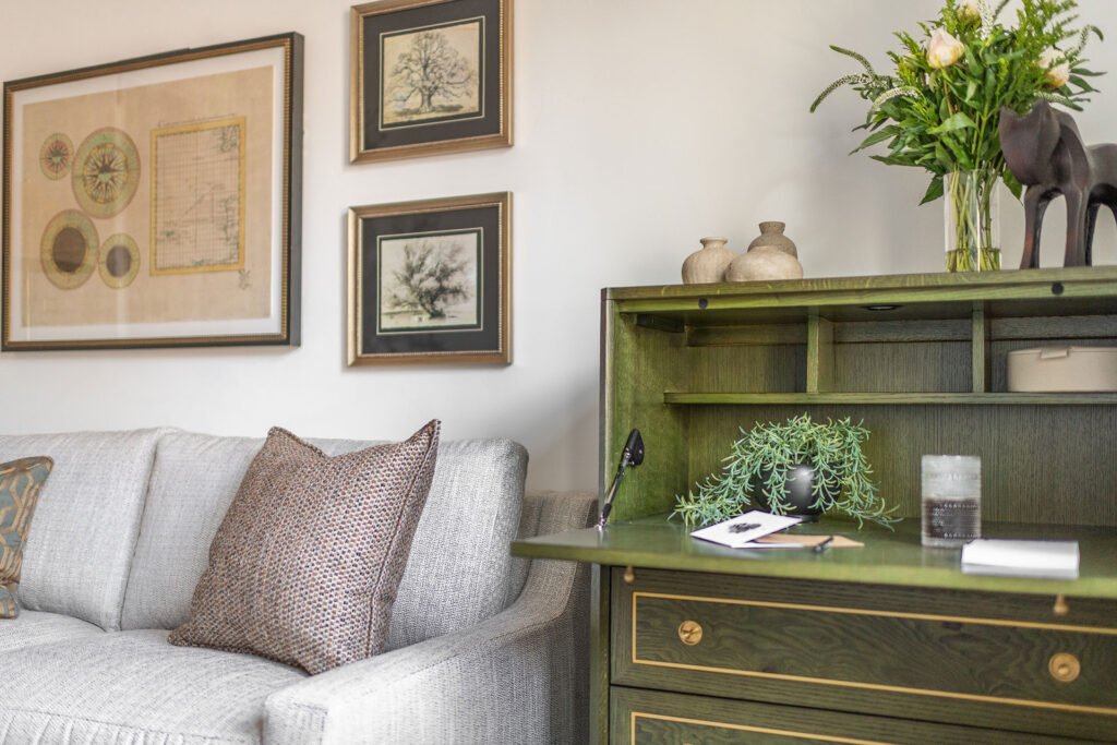 A custom sectional and ottoman invite you to stay a while in the loft-style bonus room, and the rich pop of green in the den secretary desk makes sitting down to work feel more like play. The beautiful custom sofa is a hide-a-bed, welcoming even more guests with an additional private sleeping space.